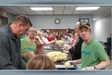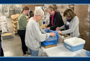 The Kiwanis and Aktion Club help stuff plastic
